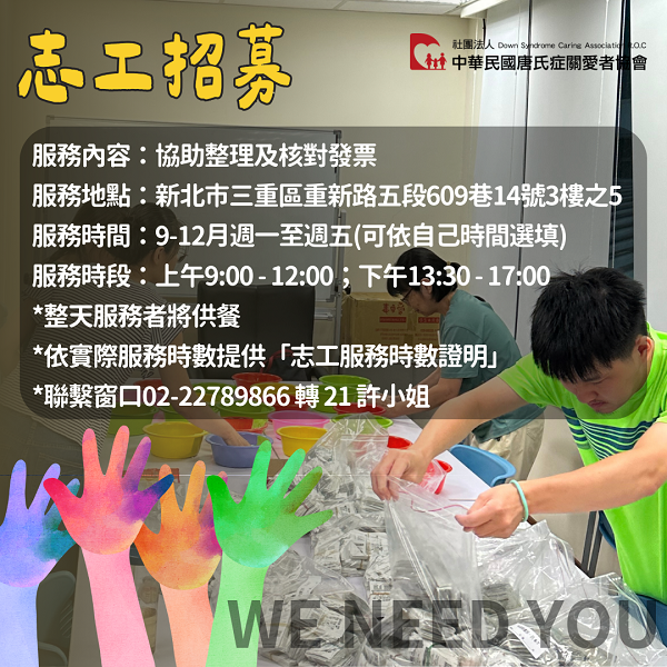 我們急需愛心志工協助整理與核對發票,無論是您的一份時間